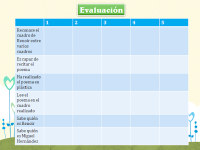- En esta actividad se ha trabajado, la creatividad de cada alumno/a, y a través de la plasticidad, la organización espacial, el desarrollo del lenguaje oral se ha memorizado el poema con la visualización del cuadro.